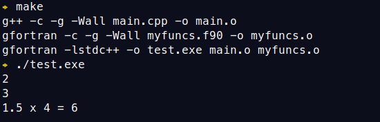 That’s all of the codes. To help compile the program, we need to Makefile. Note that the Fortran compiler is used as the linker. I didn’t try using C++ (g++ here), but it should be possible to link by adding the Fortran library (-lgfortran).