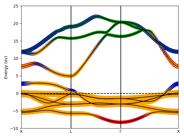 Figure 2: Au 投影能带图. 红蓝黄绿色分别为 spdf 成分.