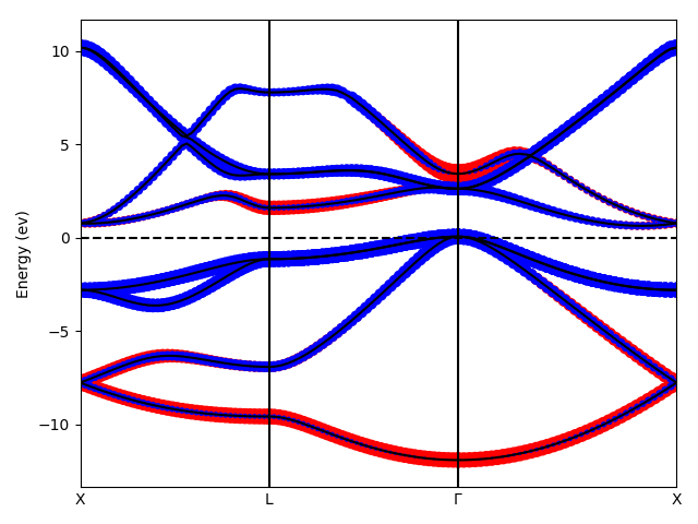 Figure 1: Si 投影能带图. 红色为 s 成分, 蓝色为 p 成分.